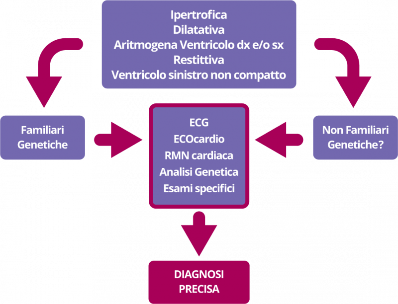 Oggi conosciamo migliaia di “mutazioni genetiche”, in numerosi geni che causano Cardiomiopatie. La ricerca delle “mutazioni” nei geni finora conosciuti è importante per valutare bene il paziente che ha una Cardiomiopatia ed i suoi familiari.